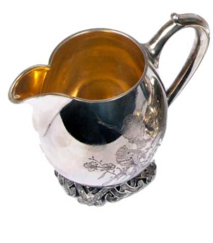 Мастерская известна в Москве в 1868 – 1897 гг. Все предметы внутри вызолочены. Все предметы сервиза украшены изящной гравировкой: реалистичным изображением двух птиц на ветках.