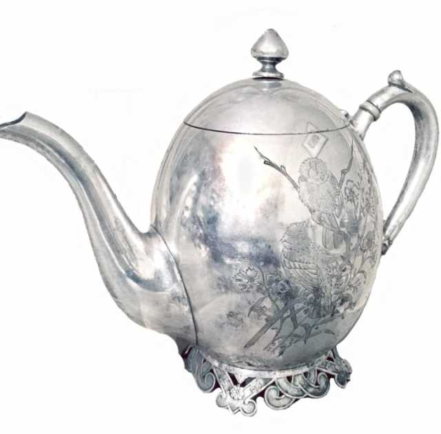 Чайно-кофейный сервиз Серебро, золочение, кость, чернь, гравировка. Общий вес сервиза - 2 кг 475 гр. Чайно-кофейный сервиз состоит из 10 предметов: выполнен в русском стиле московскими мастерам. На каждом изделии гравировка выполнена в виде растительного орнамента из черни. Сухарница - длина 23 см, ширина - 18, 5 см, вес 445 гр