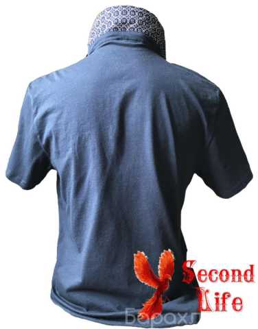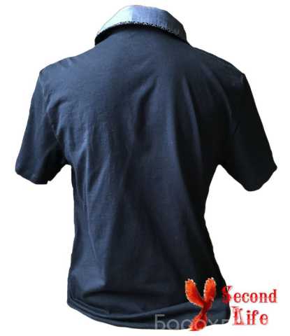 Поло тёмно-синего цвета. Воротник имеет двустороннее оформление. Сине-белый рисунок и однотонное оформление в виде джтнсы.