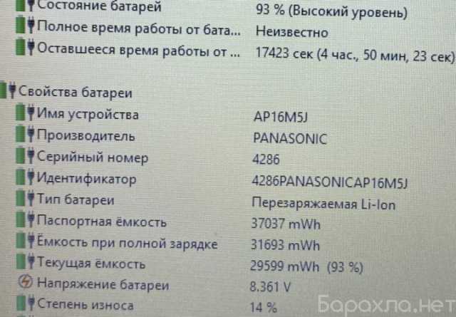 Батарея держит заряд 4-5 часов в зависимости от нагрузки (износ 14%, фото 6).