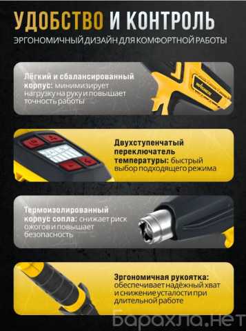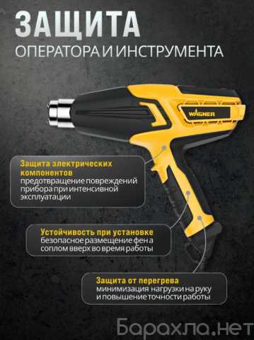 Максимум внимания уделено безопасности — фен оснащен тепловым предохранительным датчиком, регулирующим тепловое излучение. Термостойкий кожух с боковыми распорками предотвращает контакт горячего сопла с поверхностью обрабатываемого изделия.