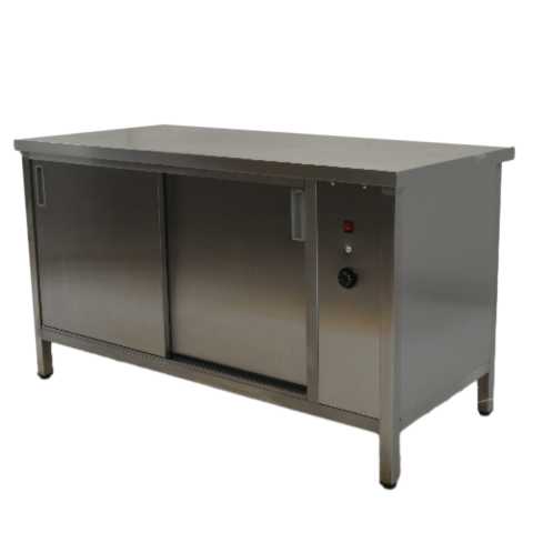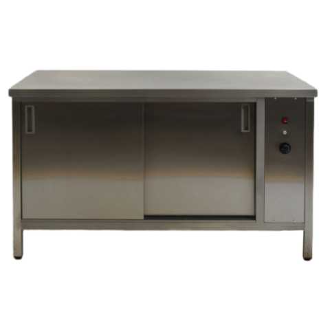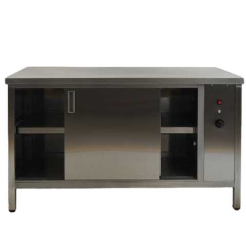Тепловой стол КАМИК СТ/К-15070 используется на предприятиях общественного питания и торговли для подогрева, демонстрации и кратковременного хранения продуктов и готовых блюд в горячем состоянии. В правой части конструкции расположен термостат, позволяющий регулировать температуру. Модель оснащена раздвижными дверями-купе, расположенными со стороны оператора. Корпус и столешница выполнены из нержавеющей стали AISI 304, дно, полка и задняя стенка - из стали AISI 430.