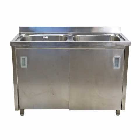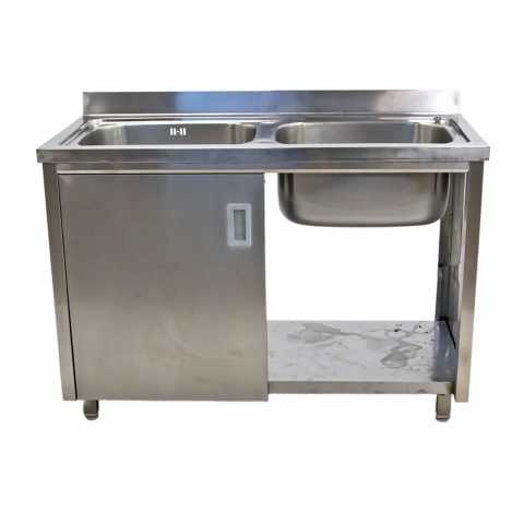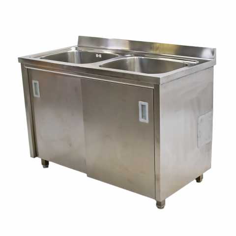 Цельнотянутая двухсекционная моечная ванна с пристенным бортиком для оснащения предприятий питания, торговли, складских и производственных помещений. Данная модель интегрирована в тумбу-купе и предназначена для помещений с ограниченным пространством. Пространство тумбы можно использовать в качестве накопителя для хозяйственного инвентаря, аксессуаров, моющих средств. Удобный доступ за счет раздвижных дверей. Ножки регулируются по высоте.