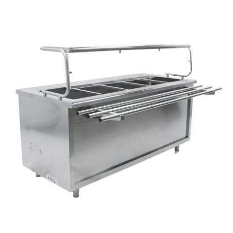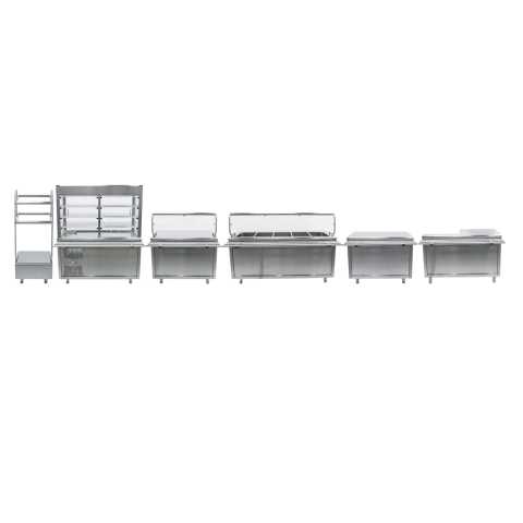 Линия раздачи Kogast (6 модулей) предназначена для кратковременного хранения готовых блюд, а также для раздачи холодных закусок, первых, вторых блюд, горячих и холодных напитков, кондитерских изделий, обеспечения клиентов столовыми приборами.