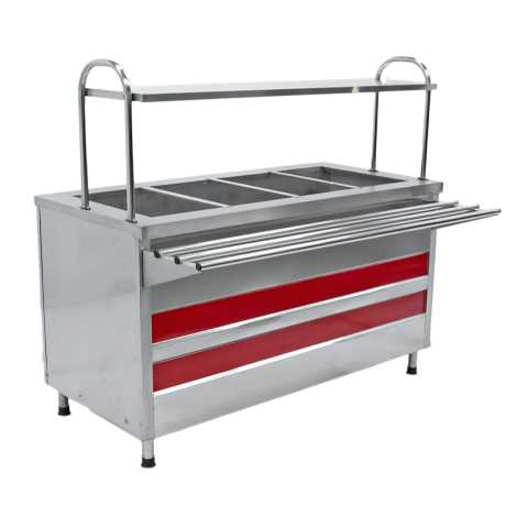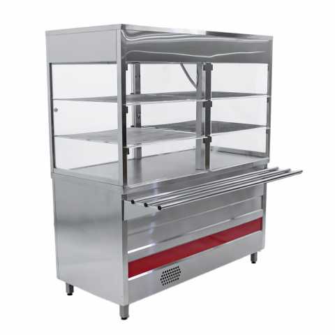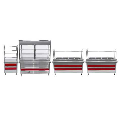 Линия раздачи Онега (4 модуля) предназначена для кратковременного хранения готовых блюд, а также для раздачи холодных закусок, вторых блюд, кондитерских изделий, обеспечения клиентов столовыми приборами.