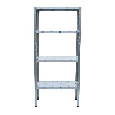 Стеллаж сборно-разборный кухонный с 4 сплошными полками из нержавеющей стали AISI 430, 4 стойками из уголка 40х40мм из оцинкованной стали, шаг регулировки полок 100мм, макс. нагрузка на полку 80кг.
