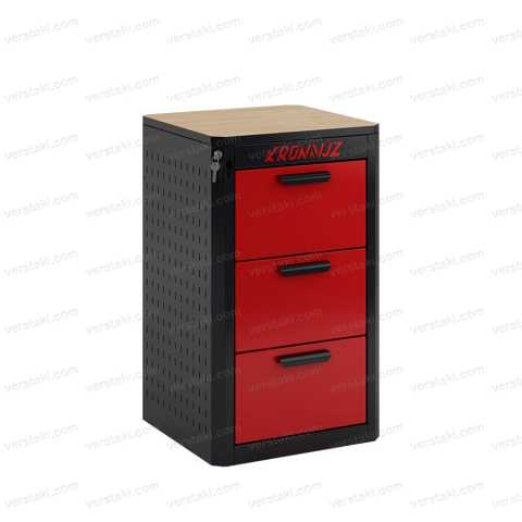Стационарная инструментальная тумба KronVuz TBS 1300 используется для хранения ручных или механизированных рабочих приспособлений, а также мелкой оснастки, например, отверток, гаечных ключей, молотков, шуруповерта, метизов. Габаритные размеры ДхШхВ - 510x525x880мм. Три выдвижных ящика, максимальная нагрузка на ящик 50кг. Максимальная нагрузка на столешницу тумбы - 1200кг. Материал столешницы - фанера 24мм.